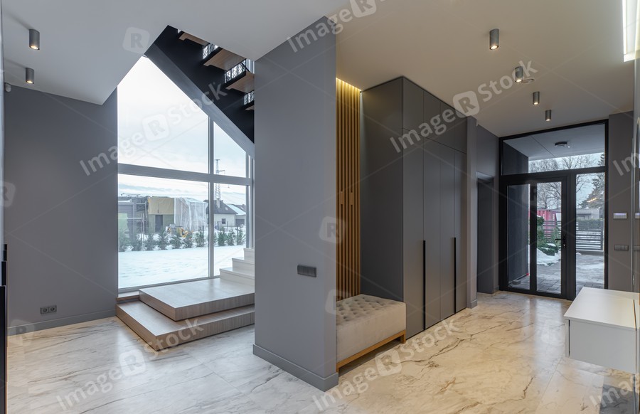 Interior of entrance hall with staircase in luxury house. Grey tones.