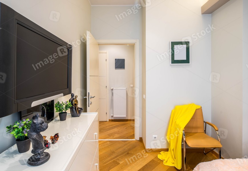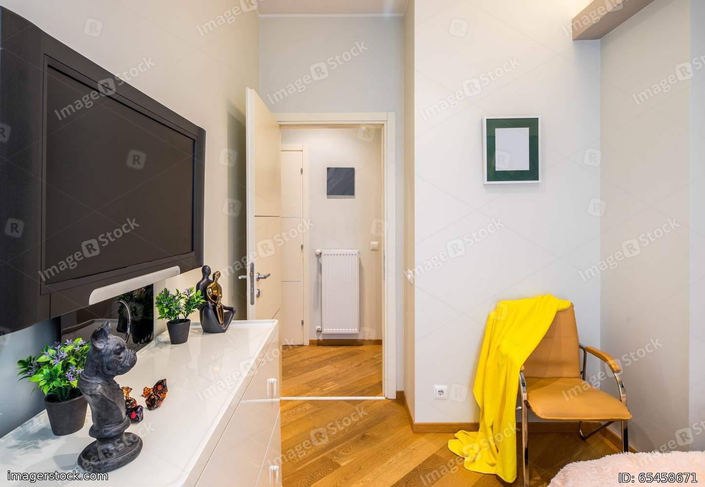 Door to the room. Light walls. TV on the wall. Brown chair.
