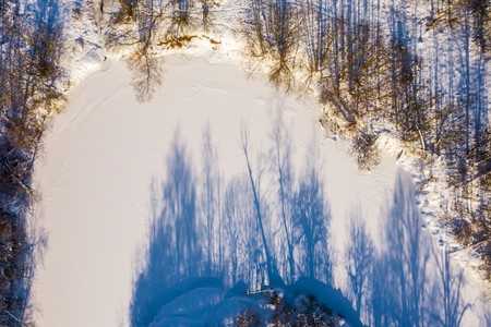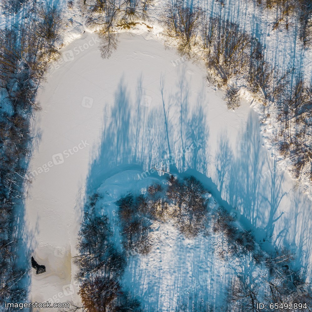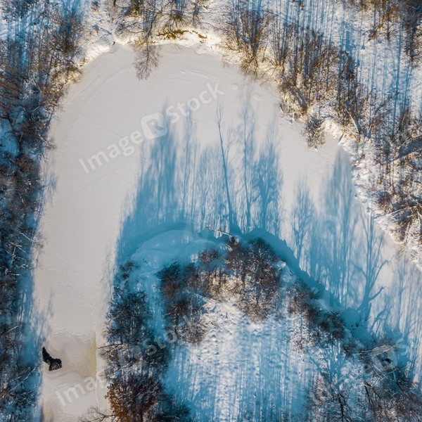 Top view of scenic winter forest and frozen river. Winter landscape.
