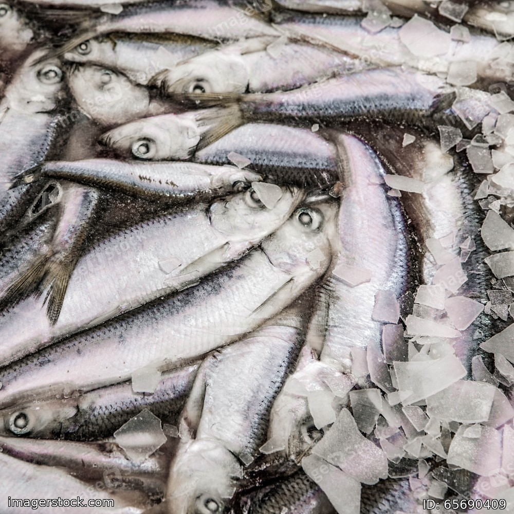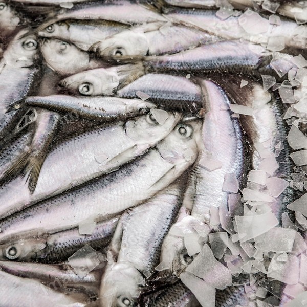 Close-up of frozen sprat in fish market. Winter fishing. Small silver fish production.