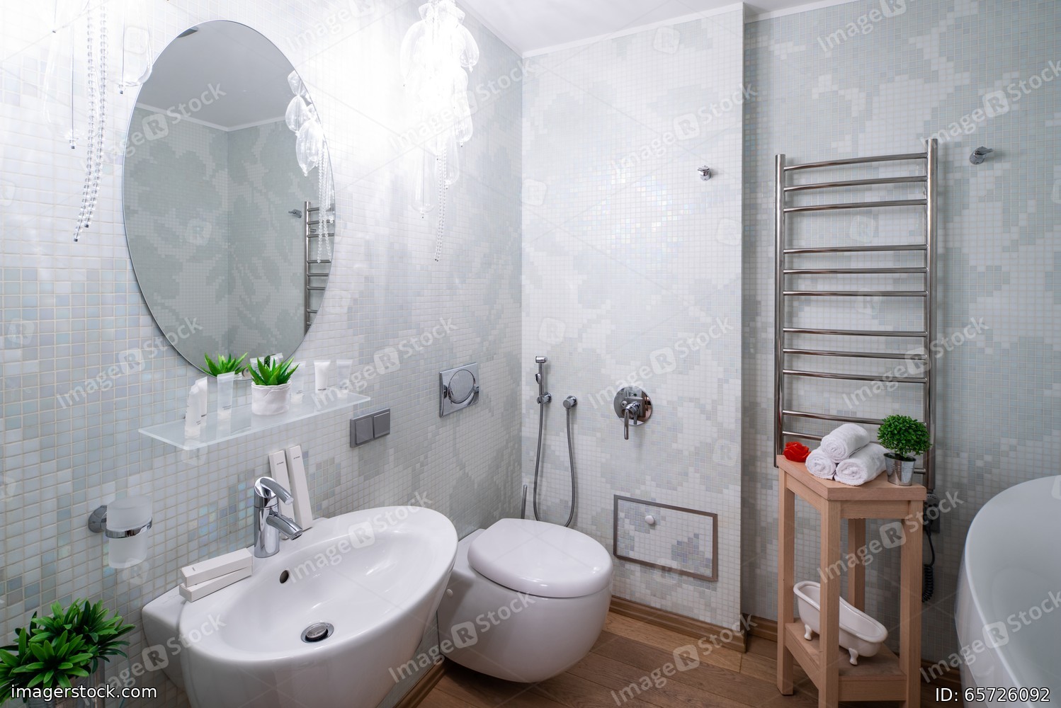 Light spacious bathroom. White tile with pattern.