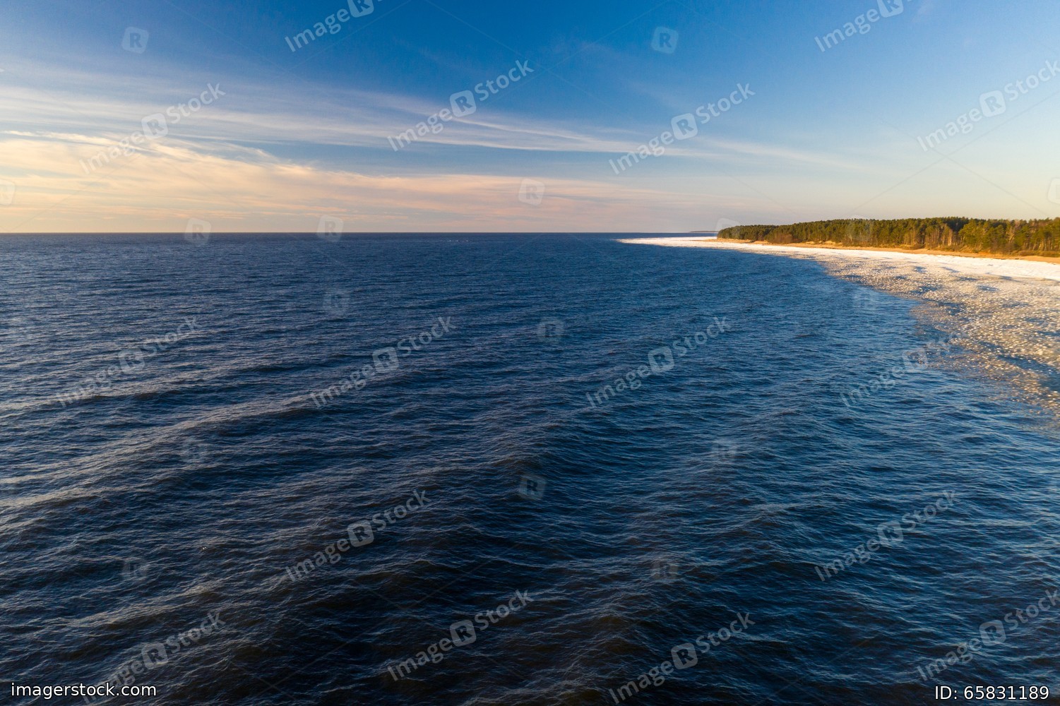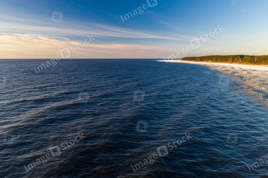 Scenic landscape of shore of Baltic sea at winter. Snow on sand.