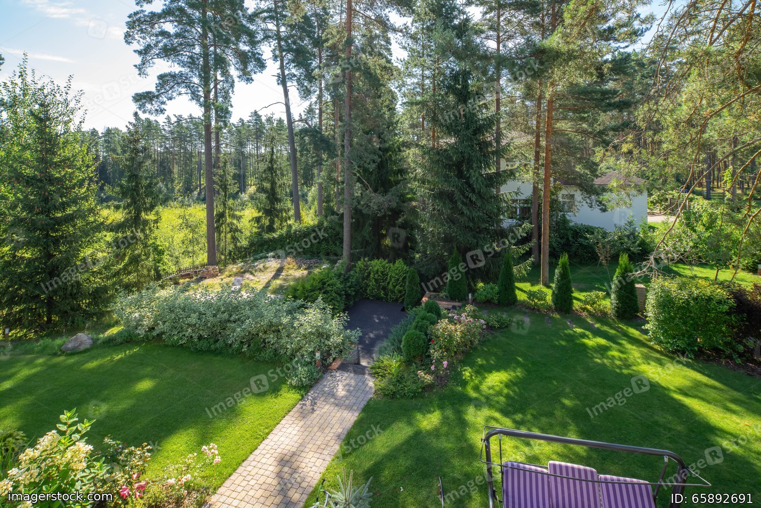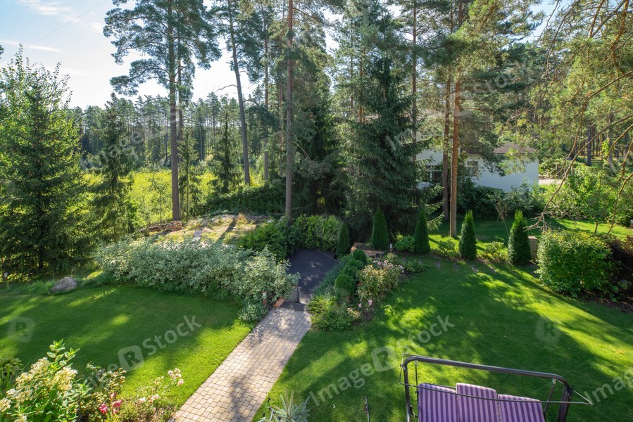 Beautiful green garden with huge trees. Sunny summer day. View from above.