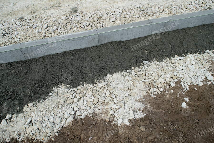 Construction of new sidewalk road. Close-up of concrete Ρurb and rubble.