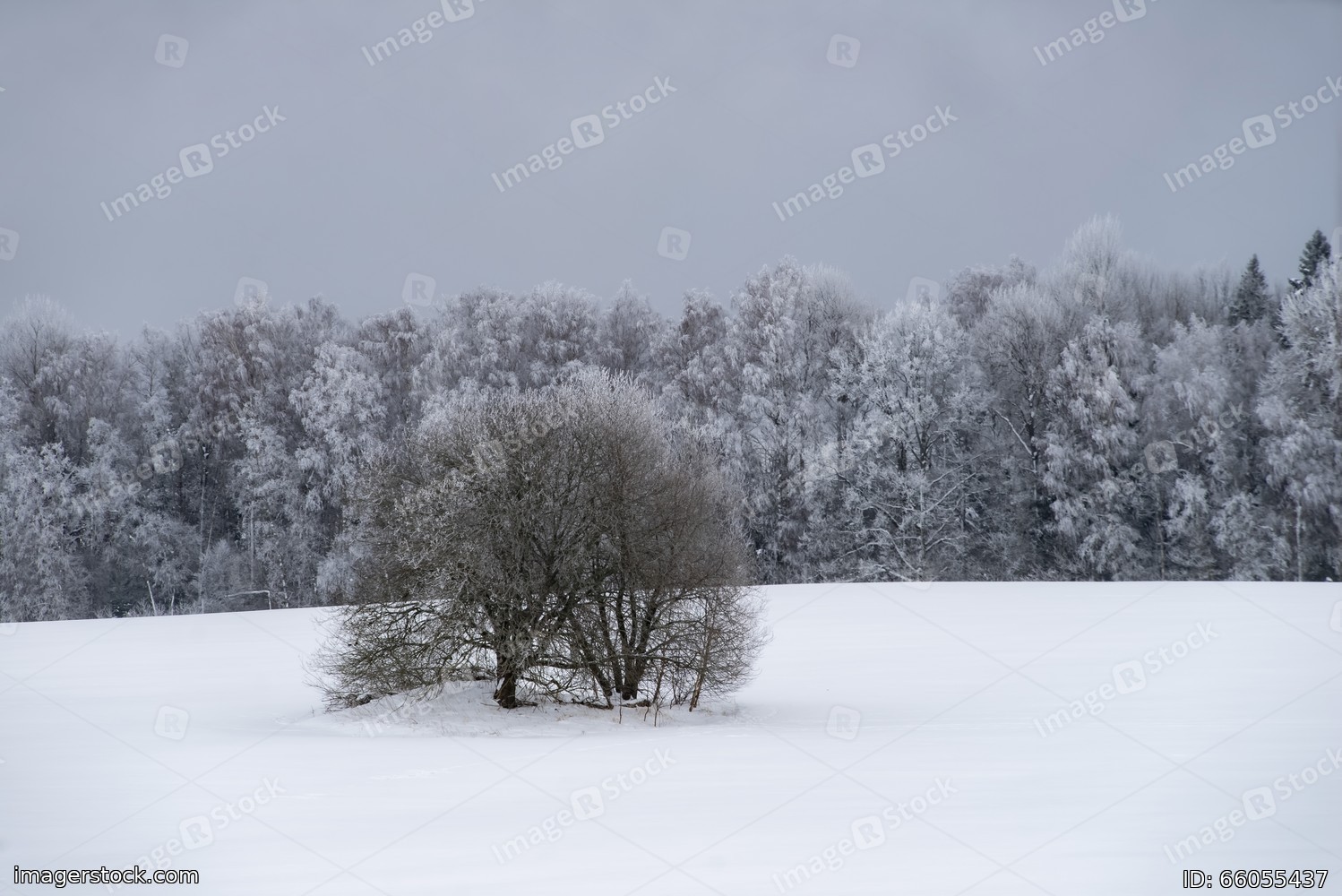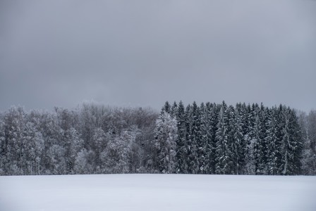 Beautiful winter landscape. Snowy forest. Grey sky.