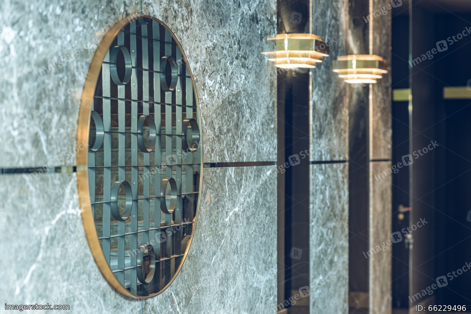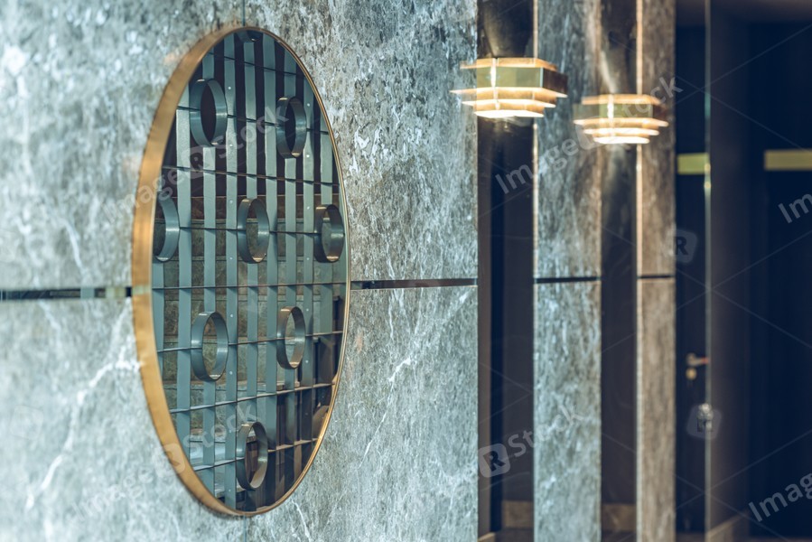 Modern interior of entrance. Mirror on wall. Wrought iron grating.