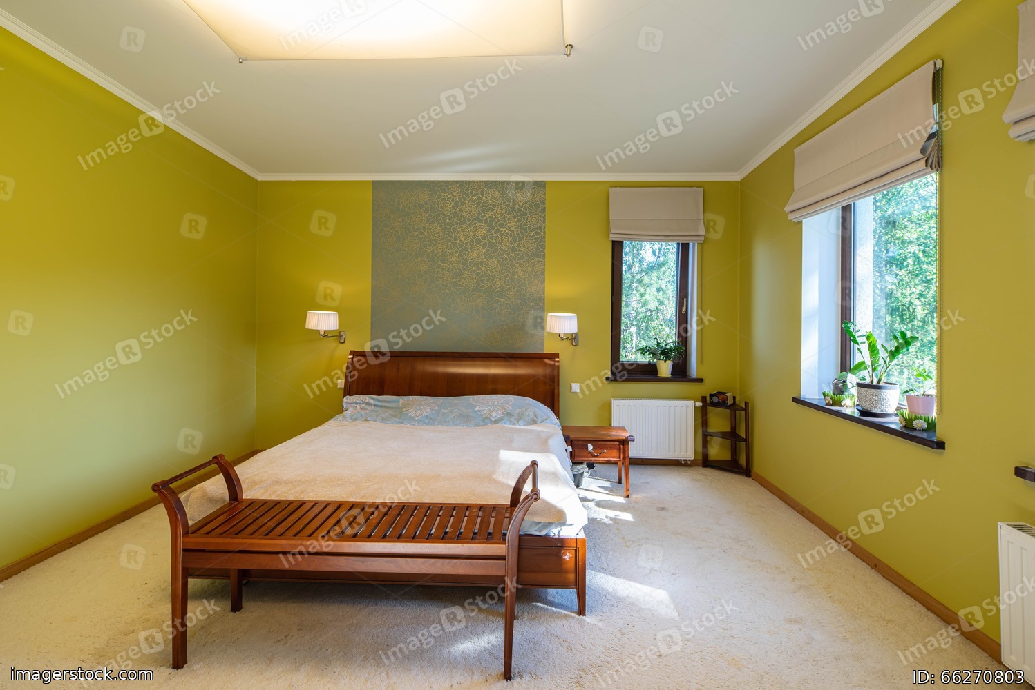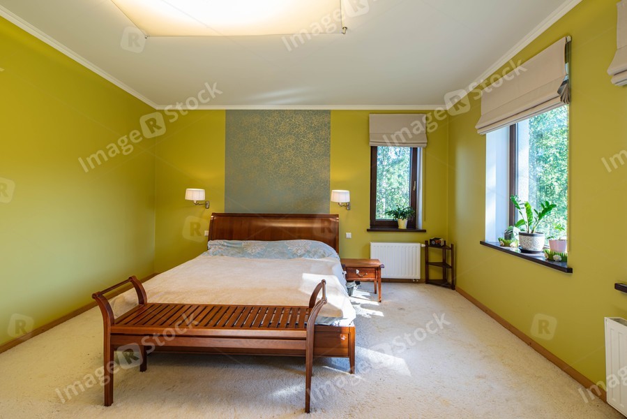 Modern interior of bedroom in apartment. Flowers on windowsills. Wooden bed and nightstand.