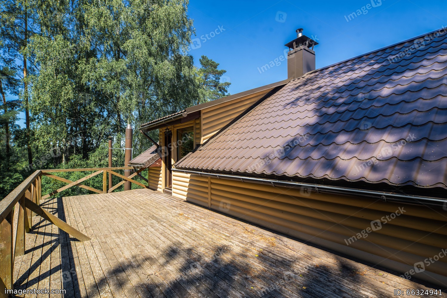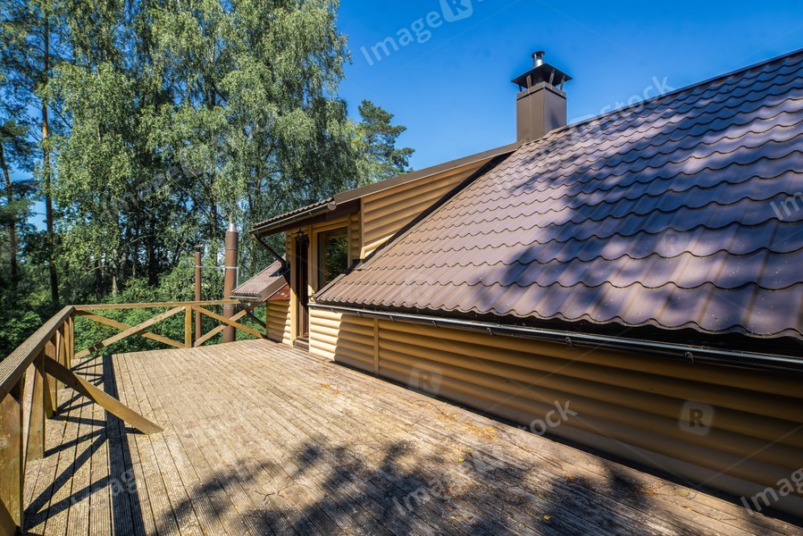 Terrace on the second floor in private country house. Sunny summer day. Green trees.