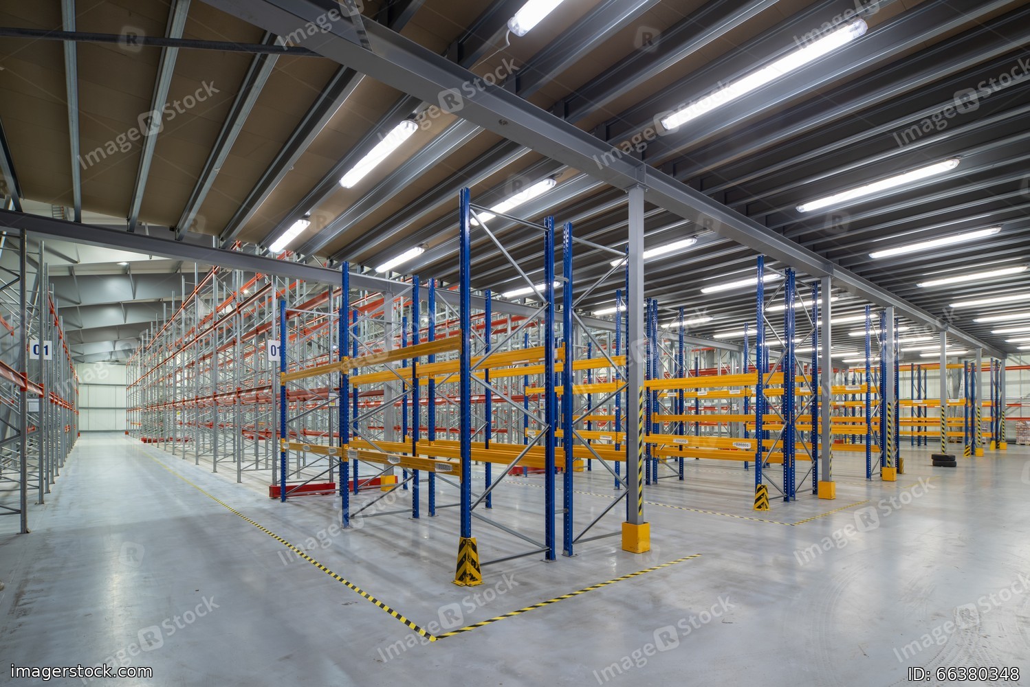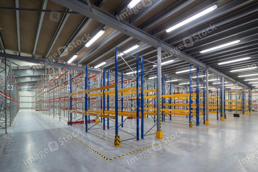 Interior of huge empty storehouse. Industrial warehouse racking.