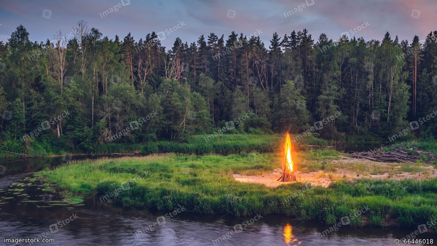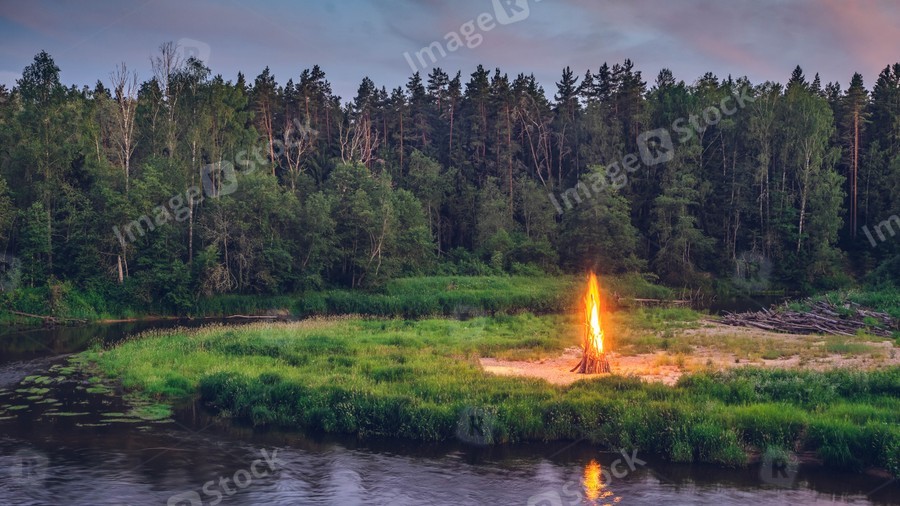 Landscape of forest and river at twilight. Huge fire. Midsummer Ligo celebration.