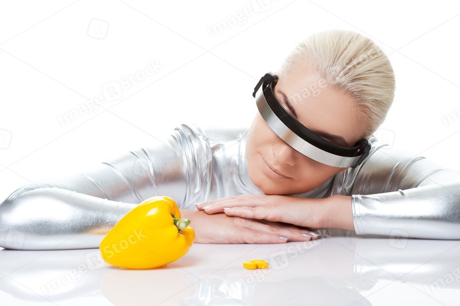Cyber woman choosing between sweet pepper and pills