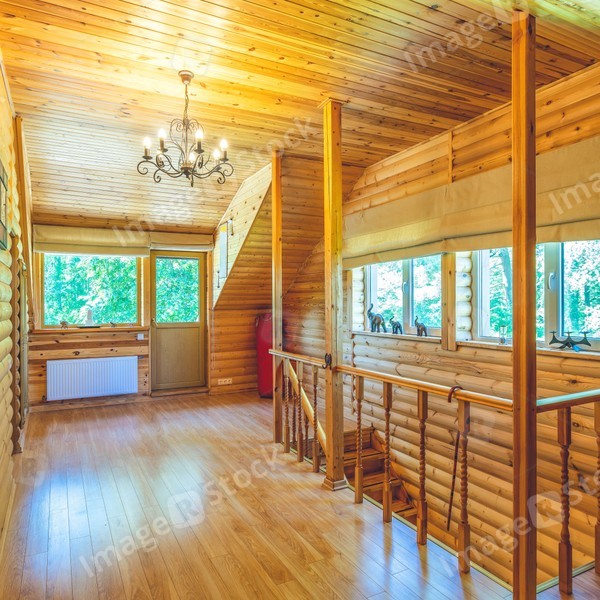 Hallway on the second floor in private country house. Eco Wooden interior. Door to the terrace.