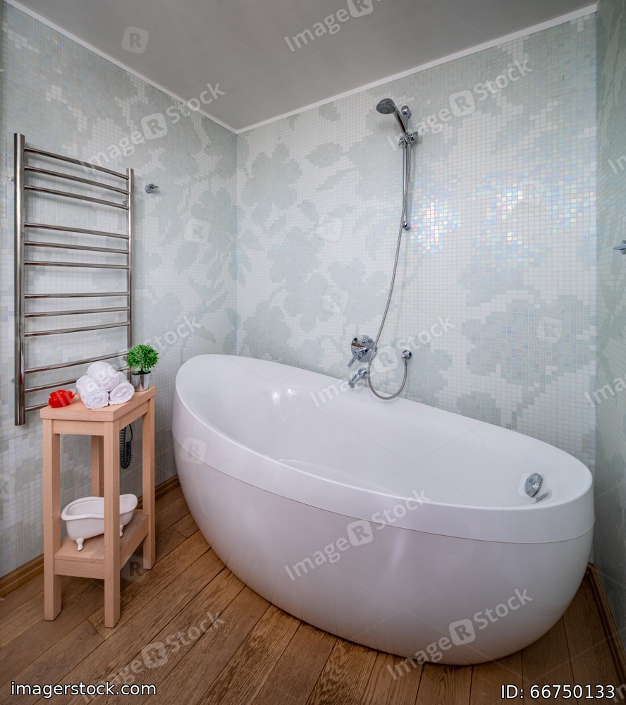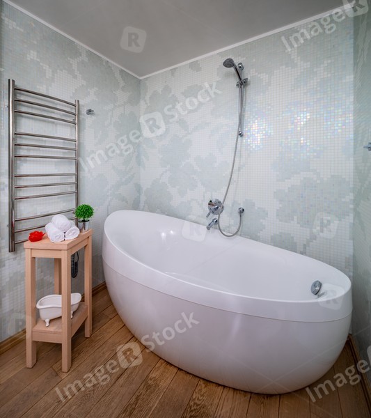 Light spacious bathroom. White tile with pattern.