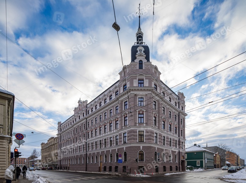 Winter cityscape of Riga. Modern architecture. Snow on road.