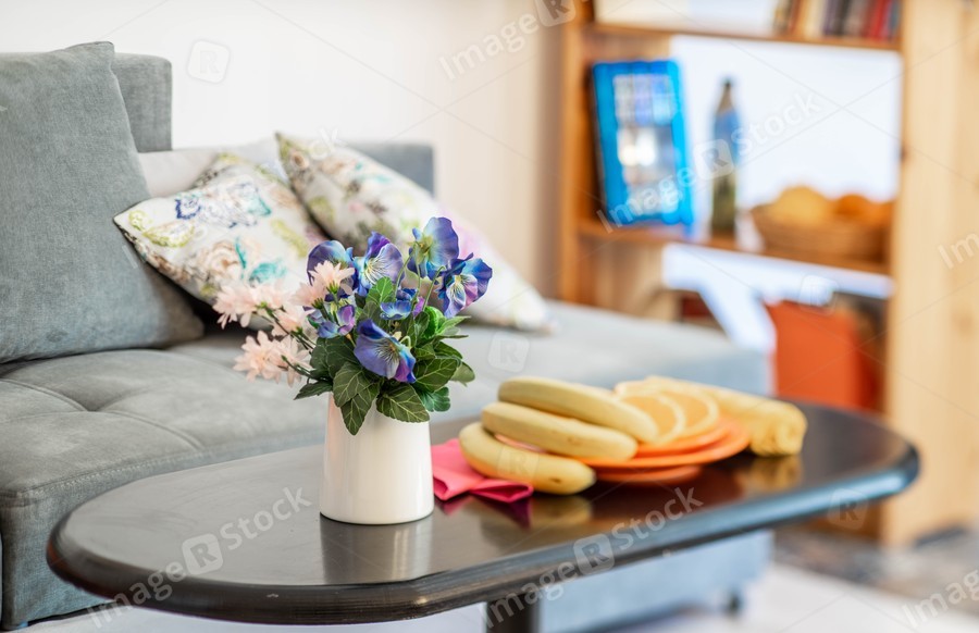 Small table with fruits in the living room. Beautiful flowers. Close-up.