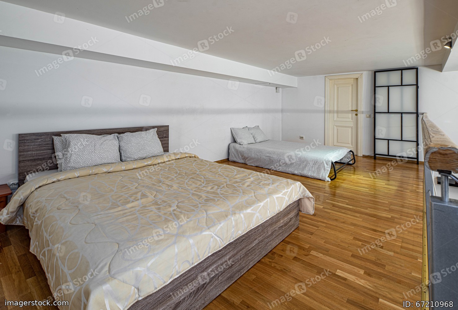 Two cozy beds in spacious bedroom. Modern interior. Wooden floor.
