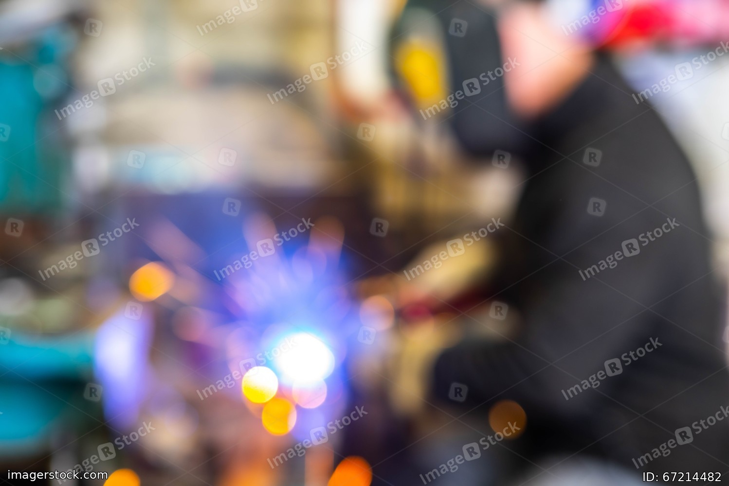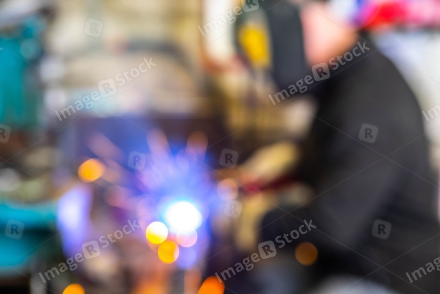 Blurred picture of worker in welding mask at factory. Welding process. Electric welding. Bright yellow sparks.