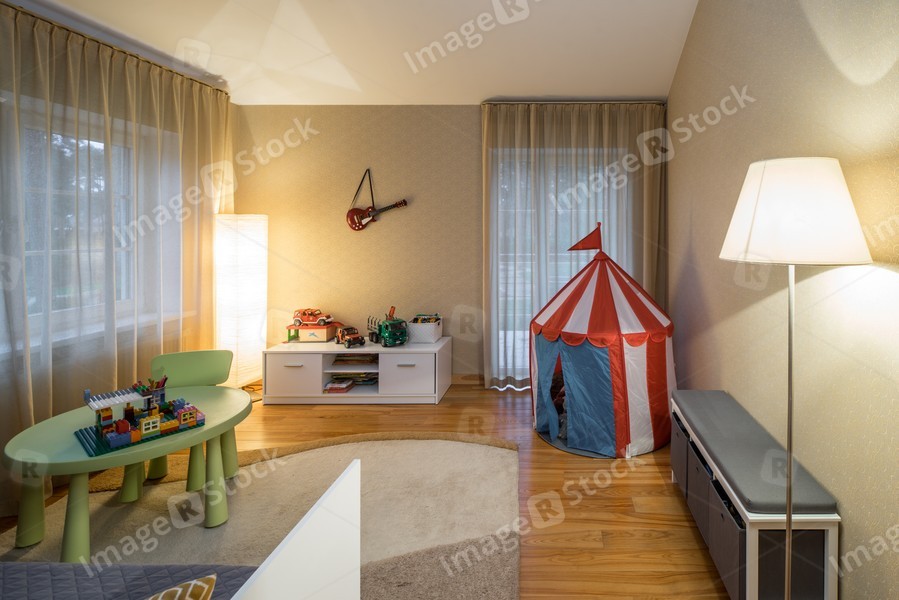 Moden interior of child room with toys. Big windows.