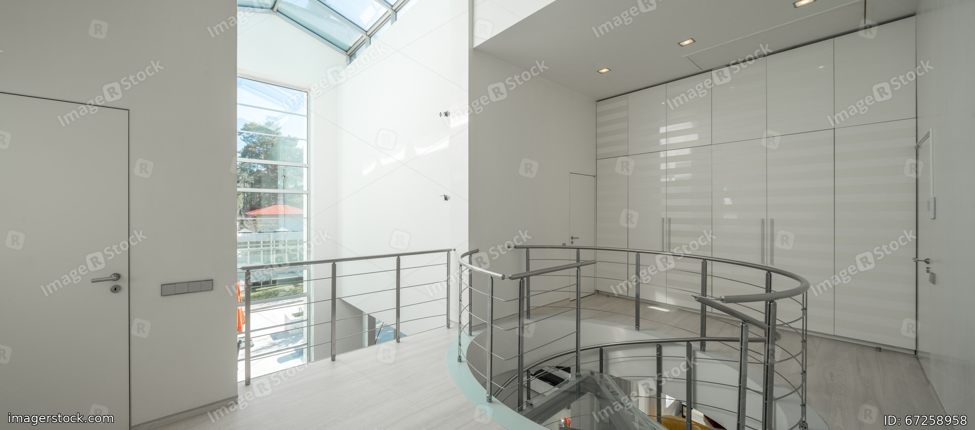 White interior of luxury private house. Glass and metal spiral staircase.