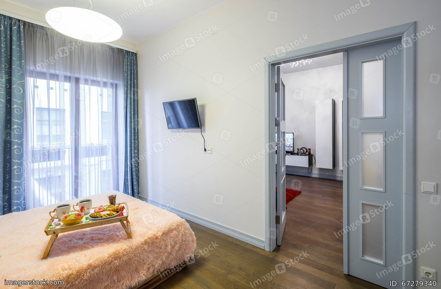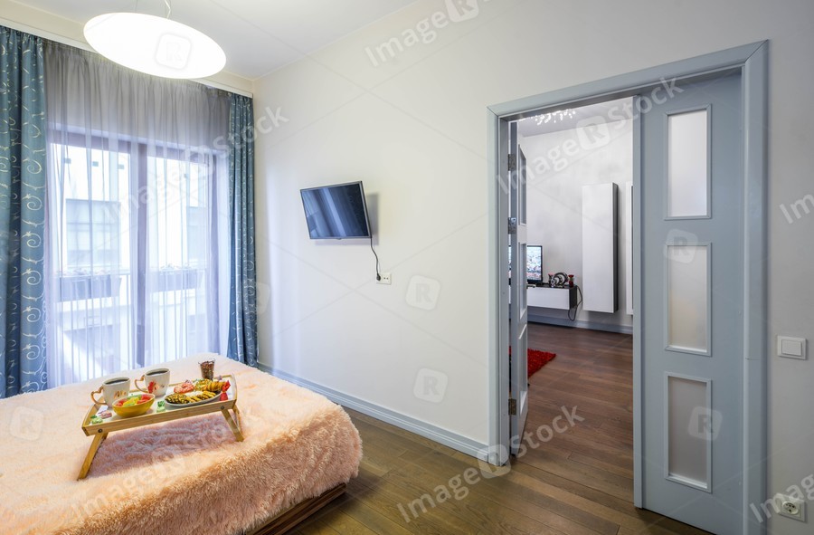 Modern interior of spacious bedroom with furniture and tv. Door to another room.