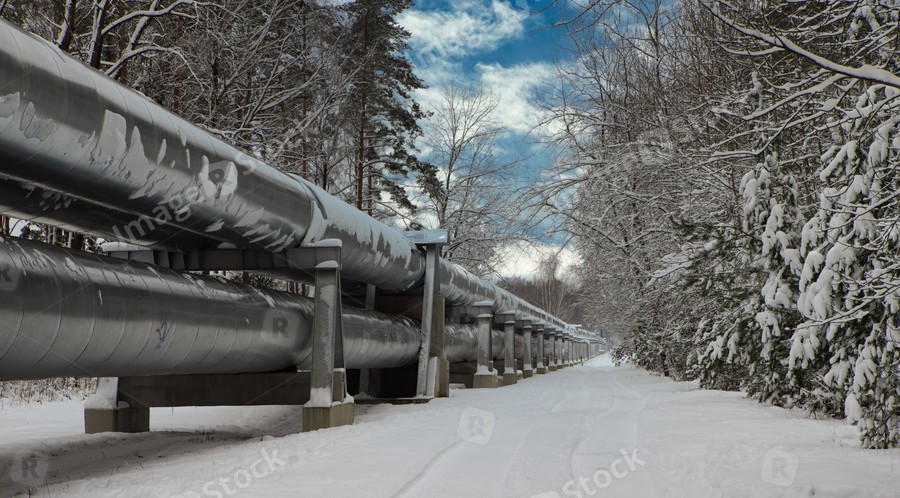 Huge industrial pipelines of central heating system. Snow on pipes.