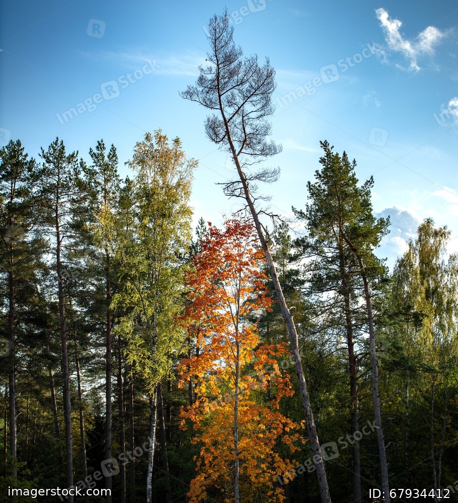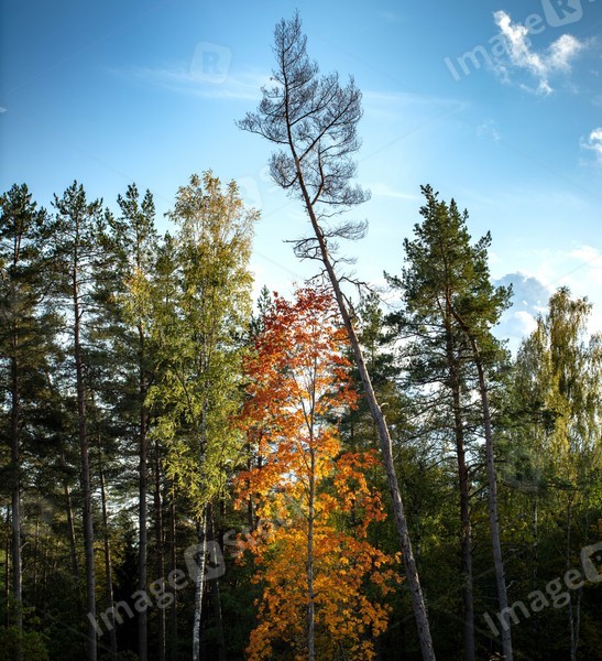 Trees in autumn forest. Sunny day. Beautiful nature.