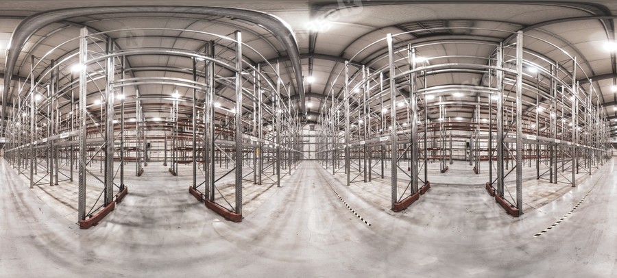 Spherical panorama 360 of empty industrial warehouse with metal rack.