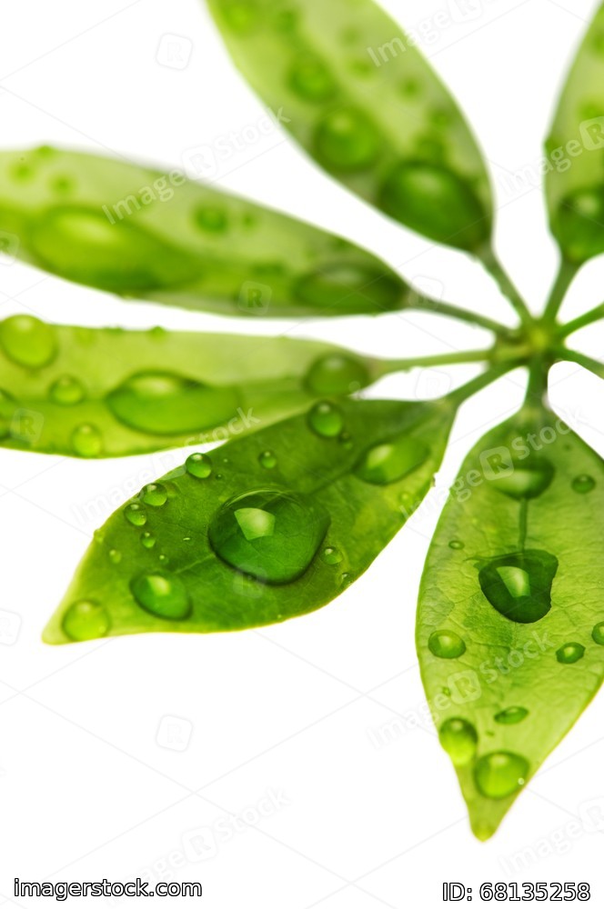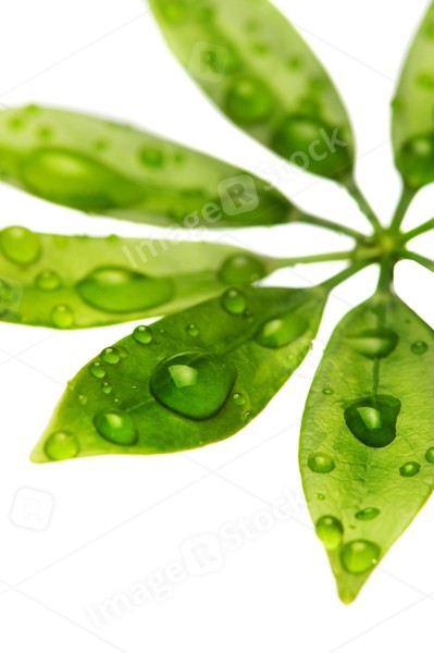Water drops on fresh green leaves. Isolated on white background