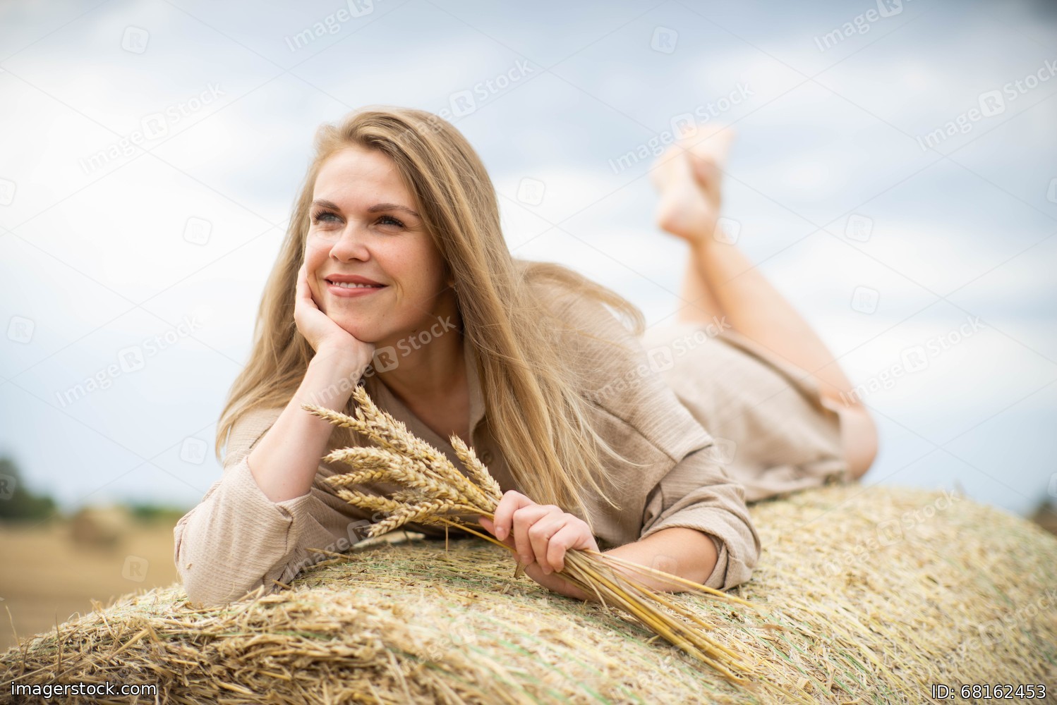 Beautiful happy woman lying on a haystack.