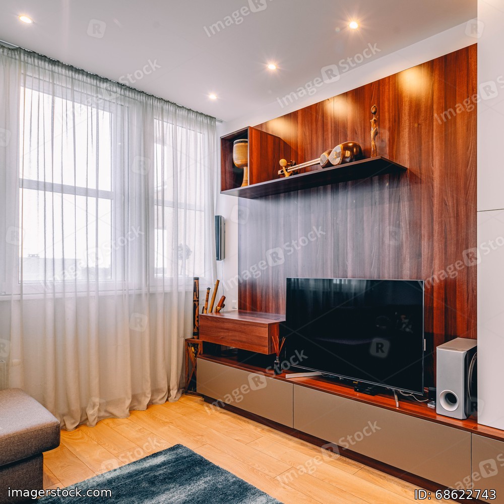 White and wooden wall unit with TV and decor. Modern interior of living room in luxury apartment.