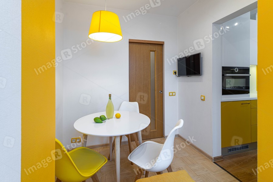 Contemporary interior of kitchen in apartment. Liquor, lemon and pears on table. TV on wall. Wooden door. Yellow and white.
