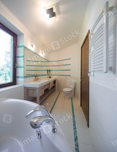 Modern interior of luxury bathroom in private house. Sink and mirror. Wooden drawers. White toilet and bath.
