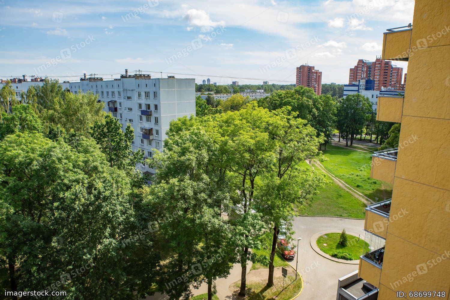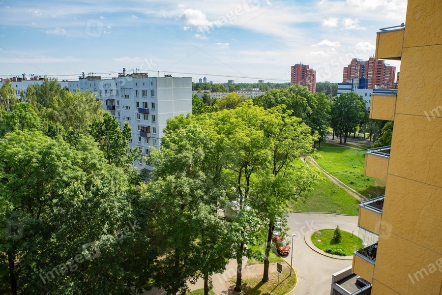 Sunny summer cityscape of Riga, Latvia. Residential buildings. Modern exterior. Green trees.