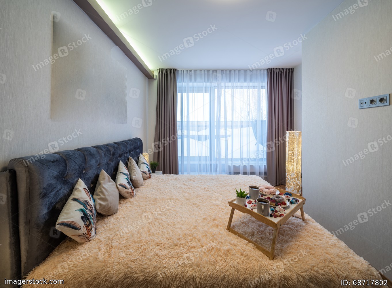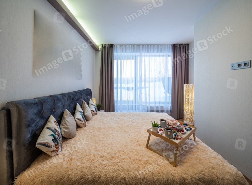 Modern interior of bedroom in luxury apartment. Breakfast on bed.