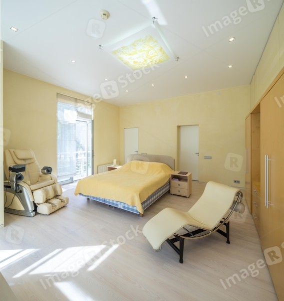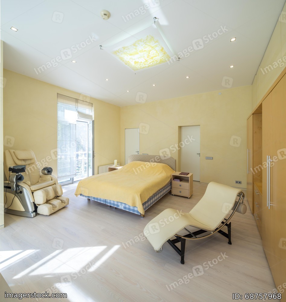 Yellow interior. Bedroom in luxury apartment. Cozy bed. Massage chair.
