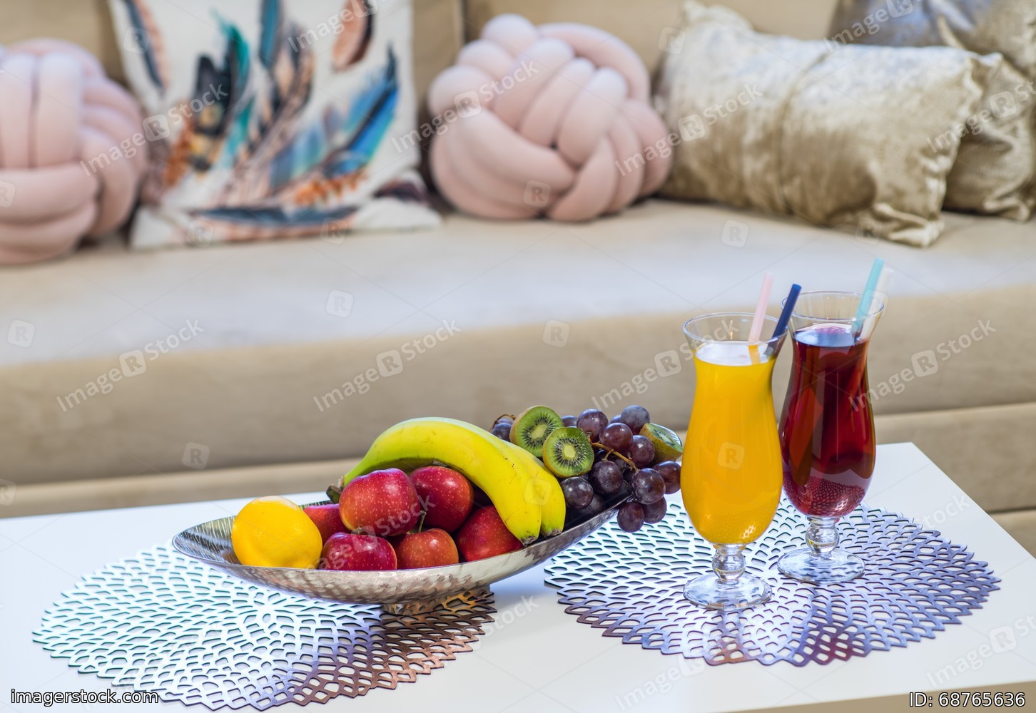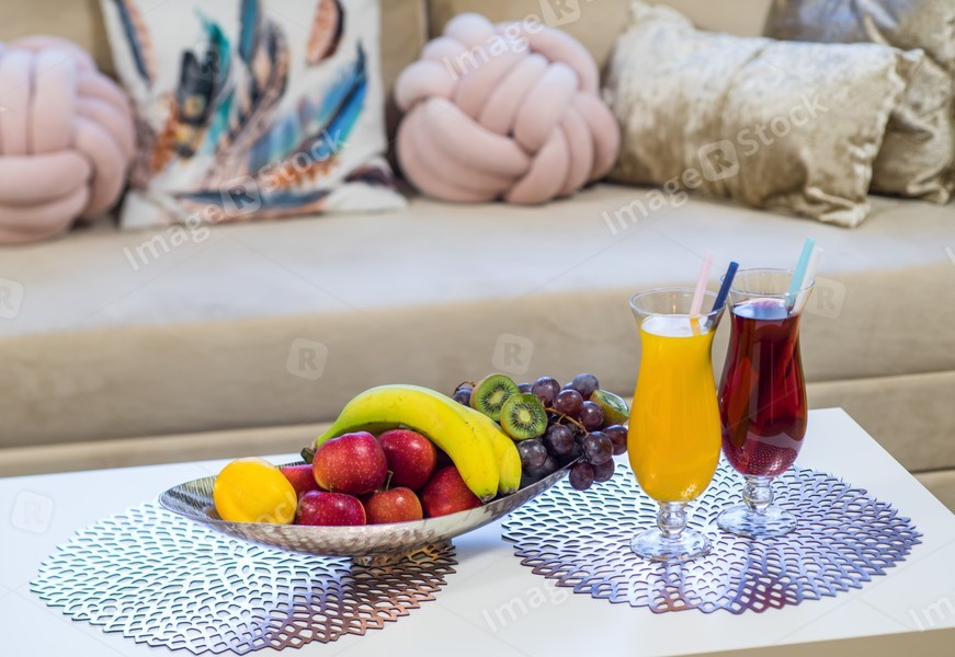 Romantic compositiom with drinks and fruits on the table. Cozy sofa.