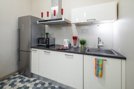 Stylish white kitchen set in modern studio apartment.