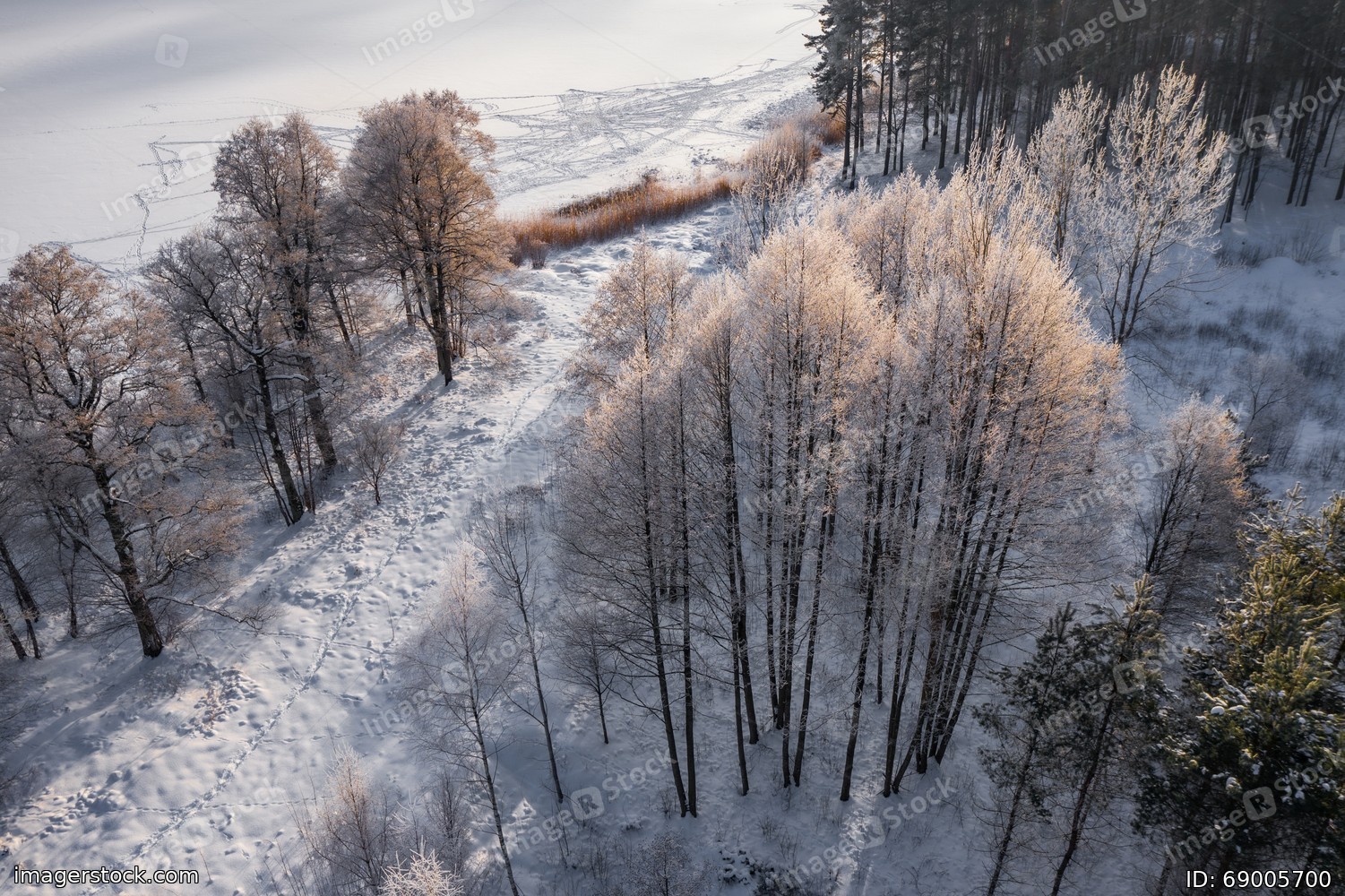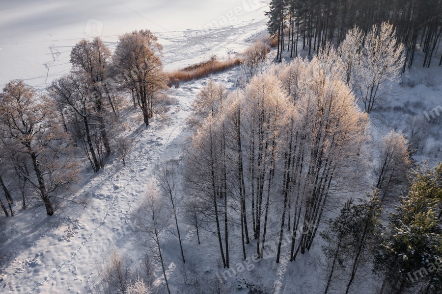 Aerial view of winter forest. Snowy naked trees. Beautiful nature.