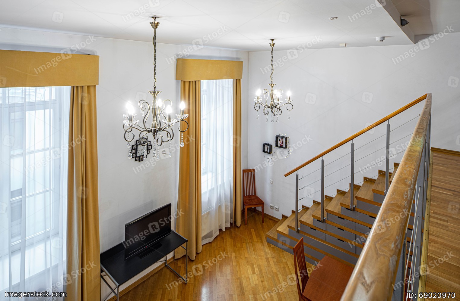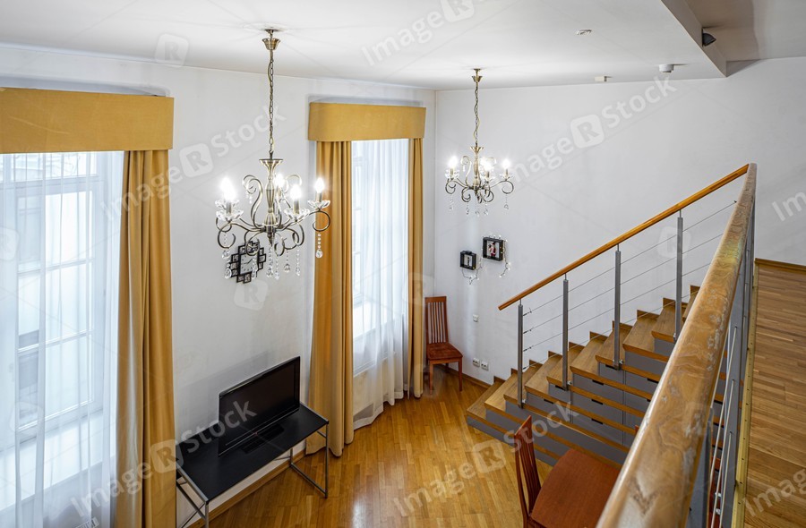 Staircase to the second floor in private house. View of room with furniture.