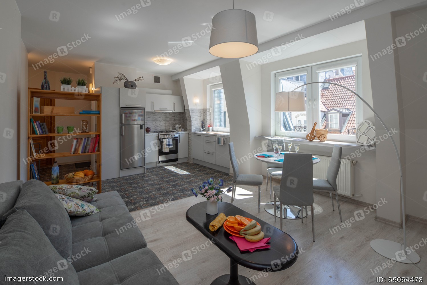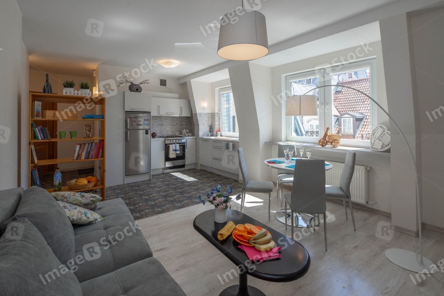 Spacious studio apartment with furniture. Living room. Kitchen. Light interior.