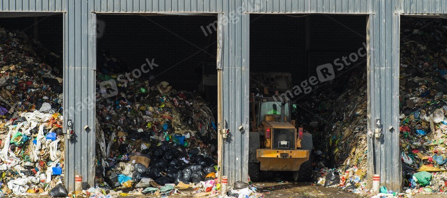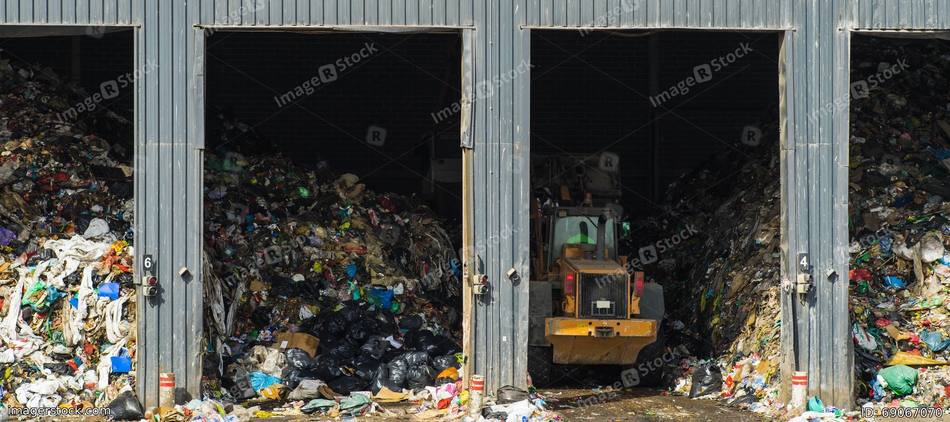 Yellow tractor in warehouse of garbage. Waste sorting. Recycling. Caring for environment.