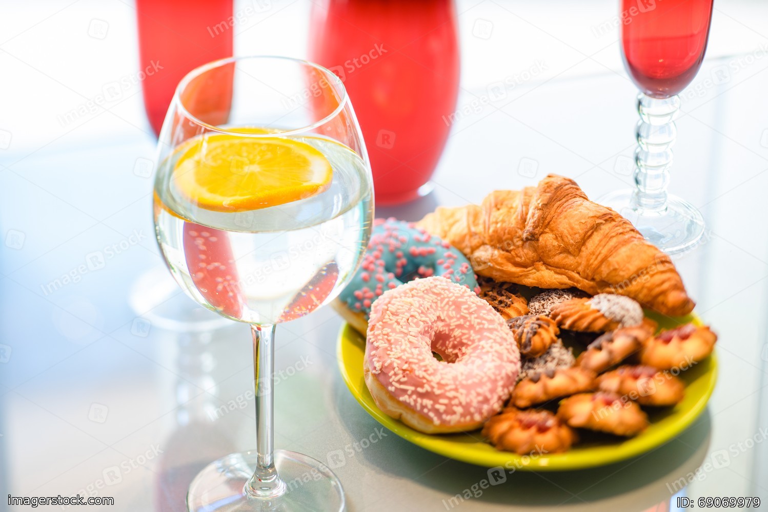 CLose-up of wine glass with lemon water and bakery on the plate.