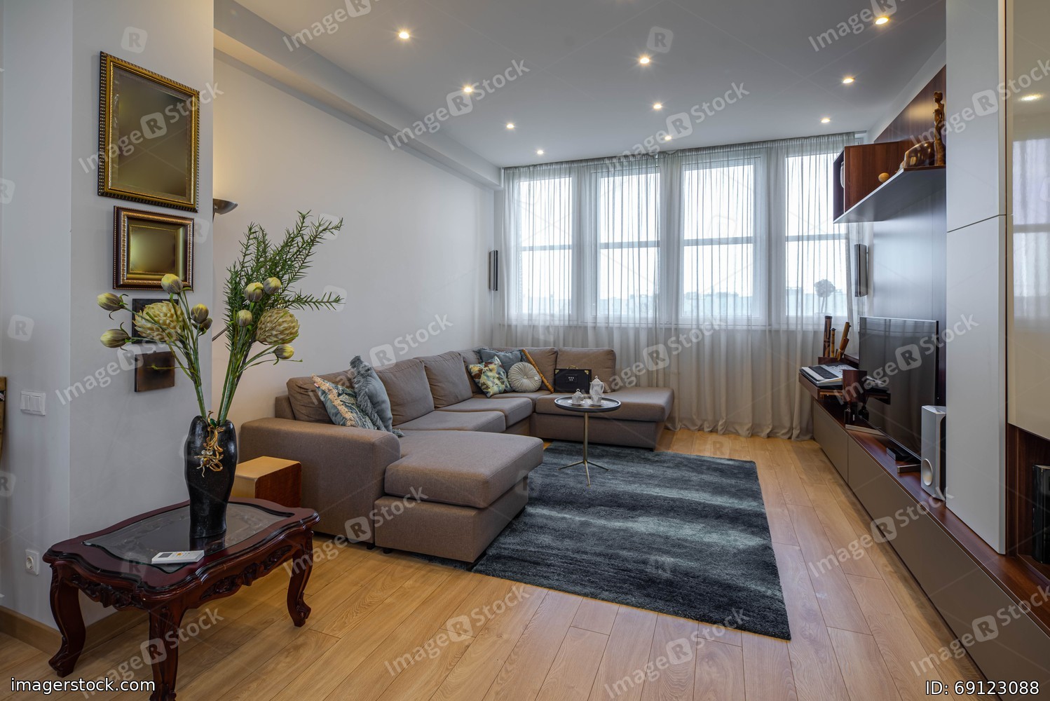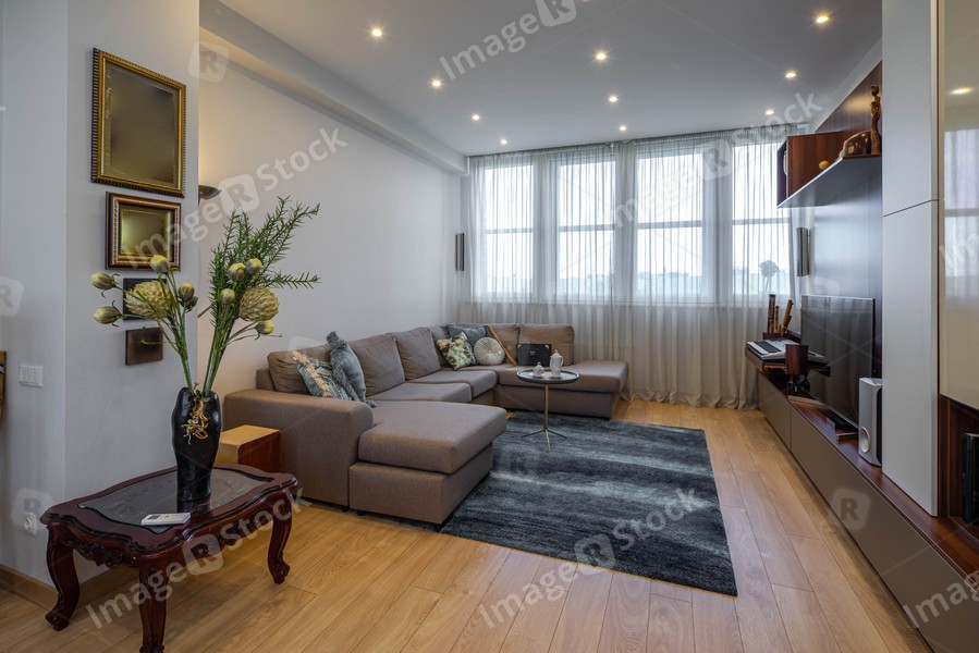 Modern interior of luxury studio flat. TV on wall unit. Cozy couch. Vase with flowers on coffee table.