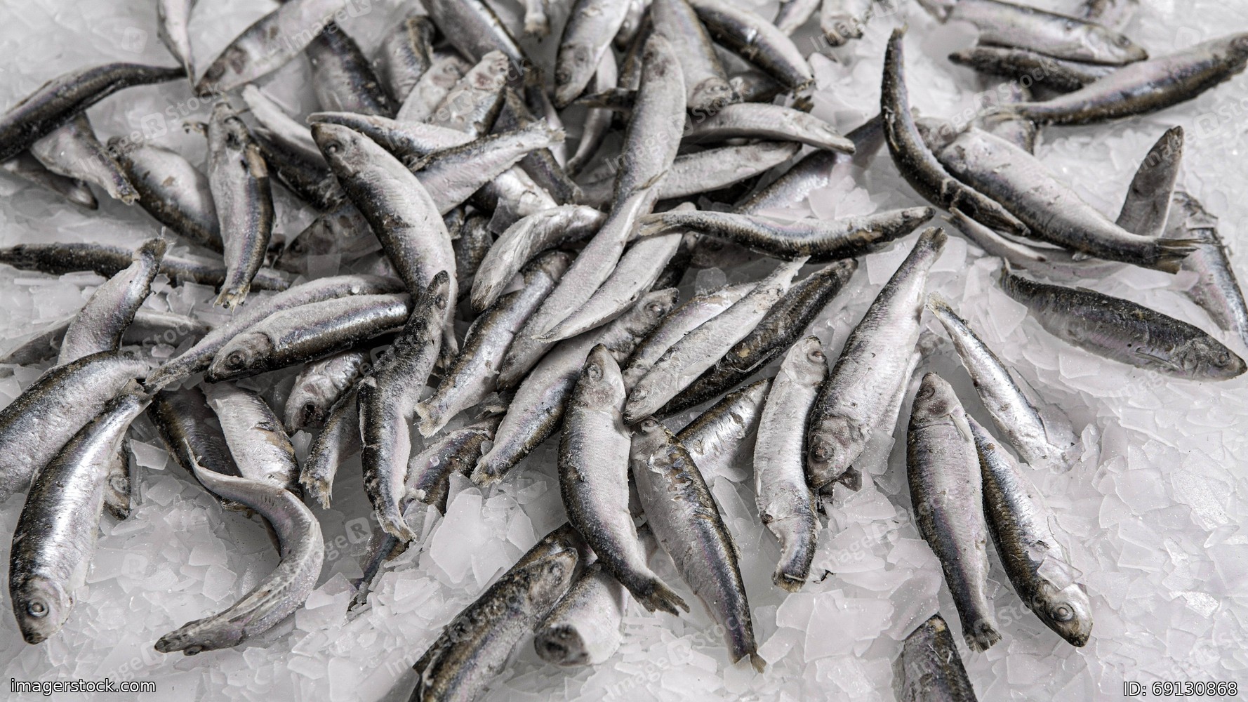 Close-up of fresh sprat on the ice in fish market. Winter fishing. Small silver fish production.