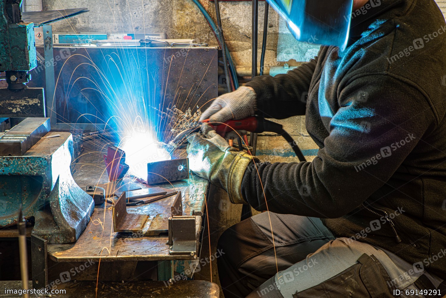 Worker in welding mask at factory. Welding process. Electric welding. Bright yellow sparks.
