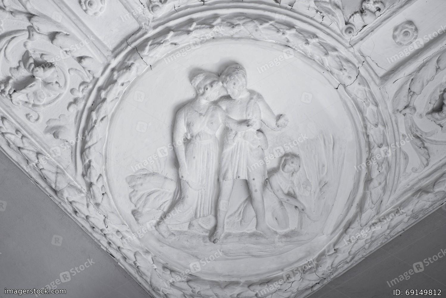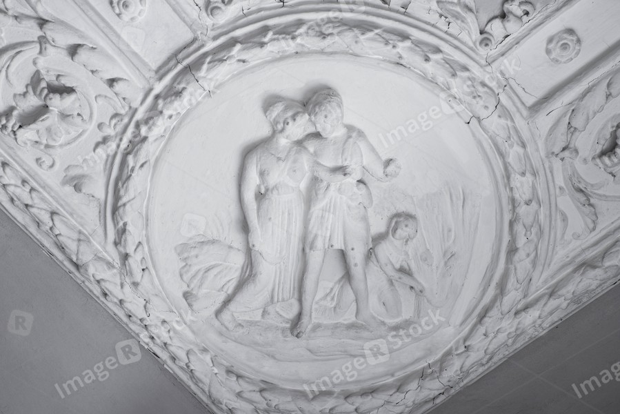 Retro moldings on the ceiling around the room. The old gypsum rosette on the celling.