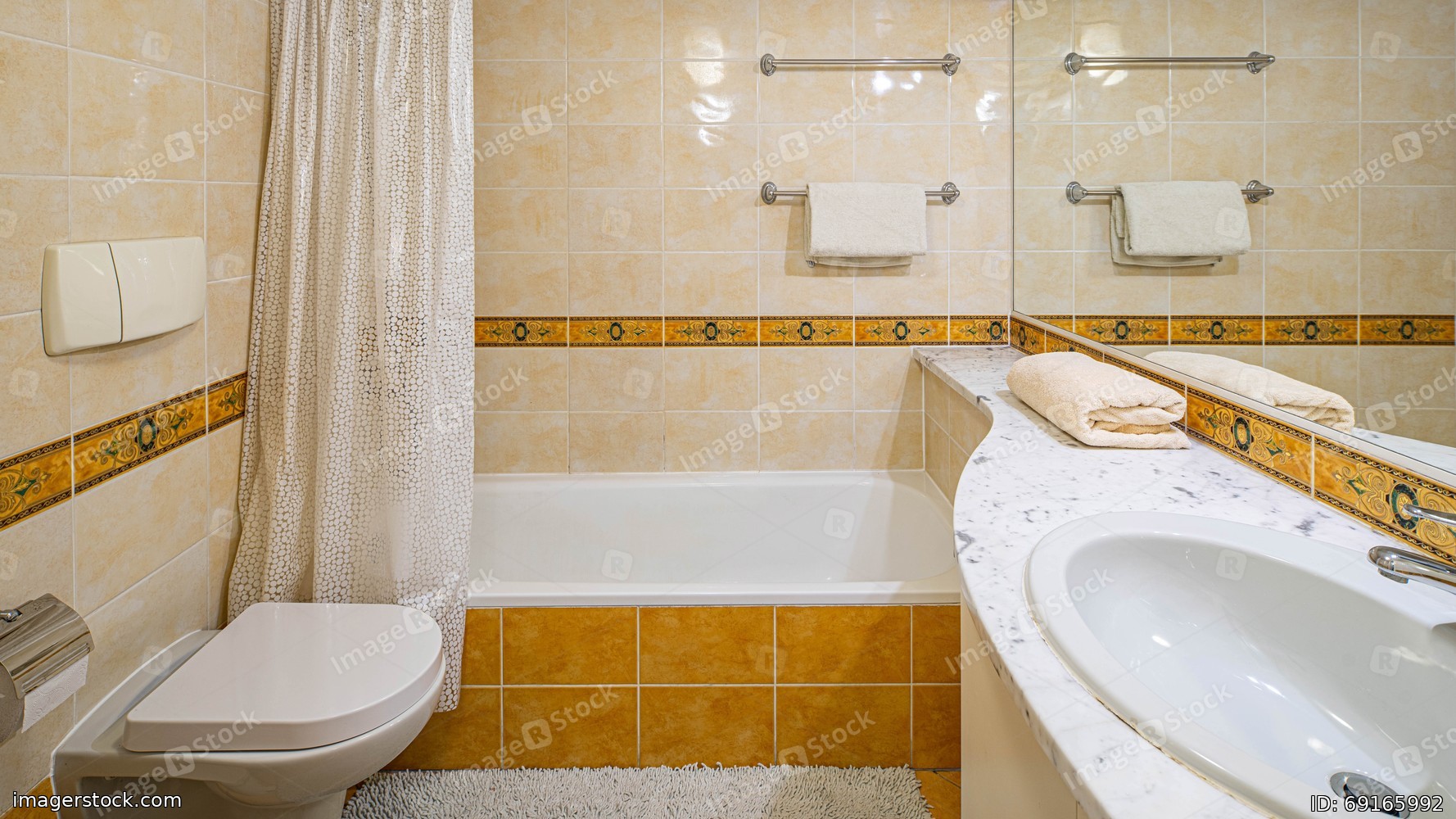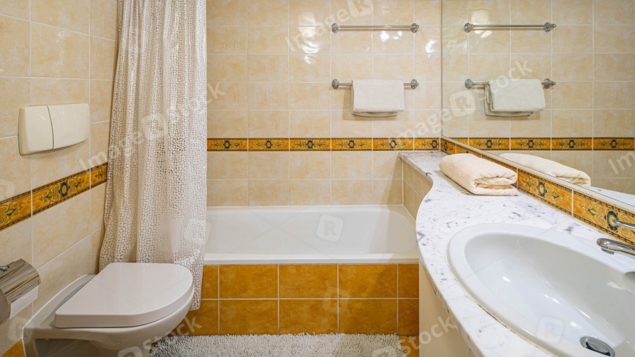 Modern interior of small bathroom with brown tile. Sink, toilet and bath.