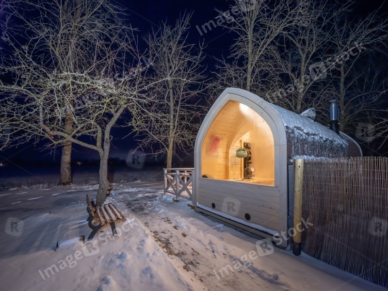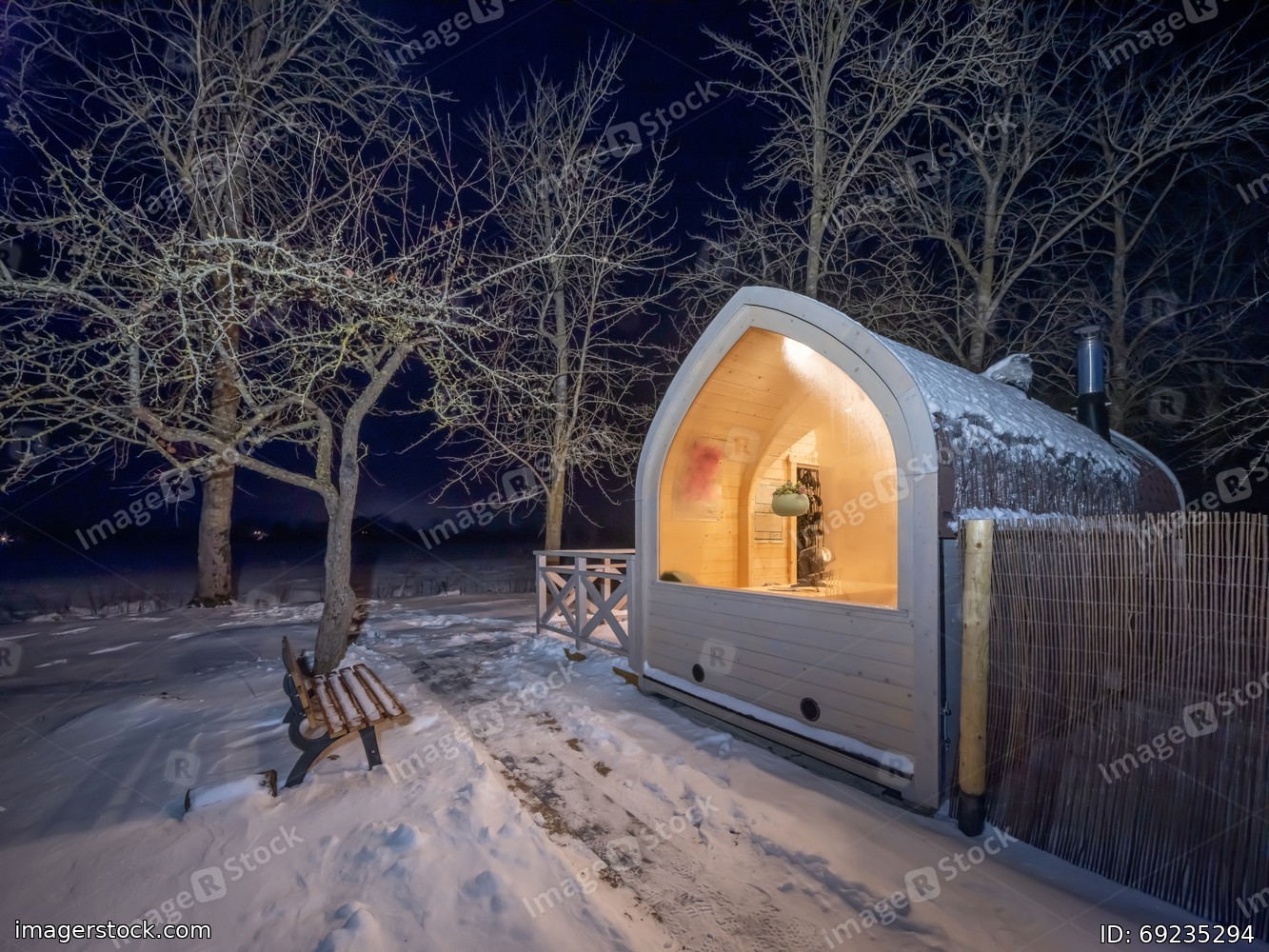 Small wooden illuminated bathhouse at winter night. Finnish sauna.