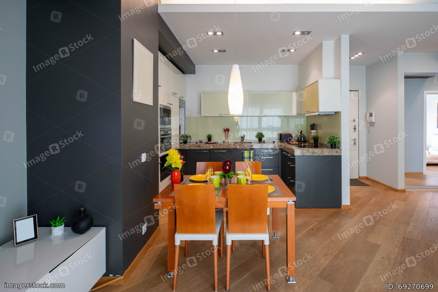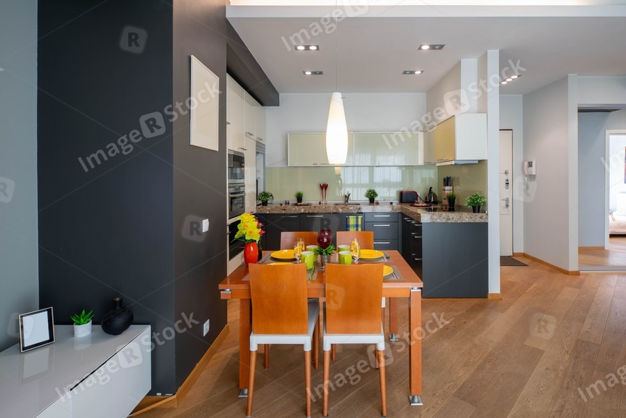 View of kitchen in studio apartment. Stylish kitchen set. Private house.