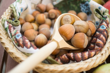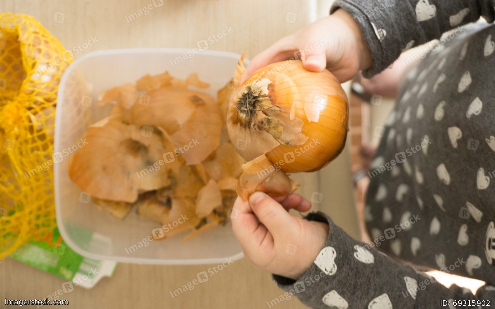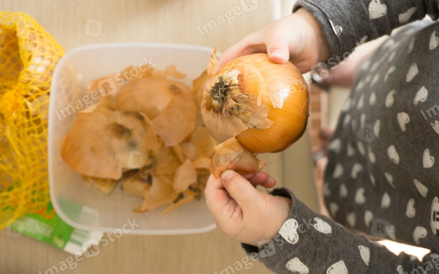 Little baby peels onion to paint the eggs during Easter